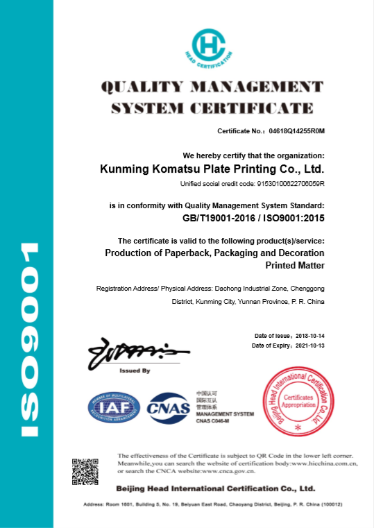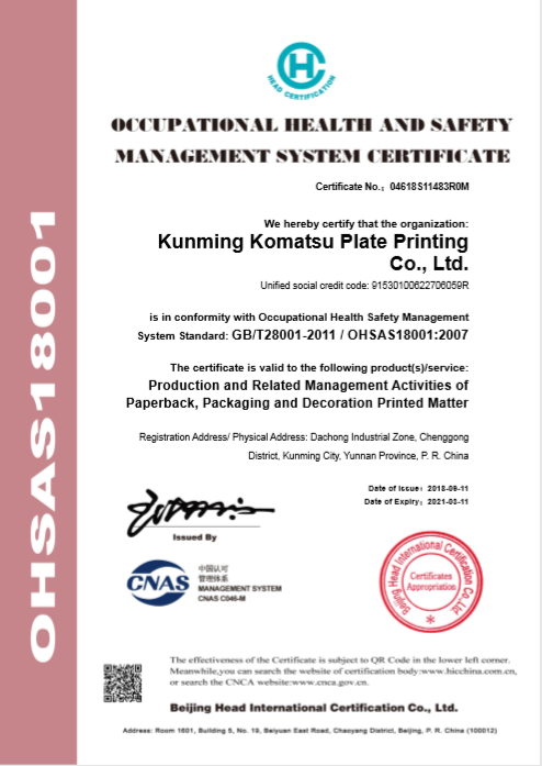 昆明小松制版印刷有限公司創立于1993年,投資總額660萬美元,現總資產約一億六千萬元,公司位于昆明經濟技術開發區呈黃路15號,占地36018平米,公司現有員工120人。是一家專注于藥包、食品包裝、高檔包裝、教科書、數字印刷等精細加工為一體的現代印刷企業。公司通過了‘三標一體’及‘十環綠色認證’,‘云南...